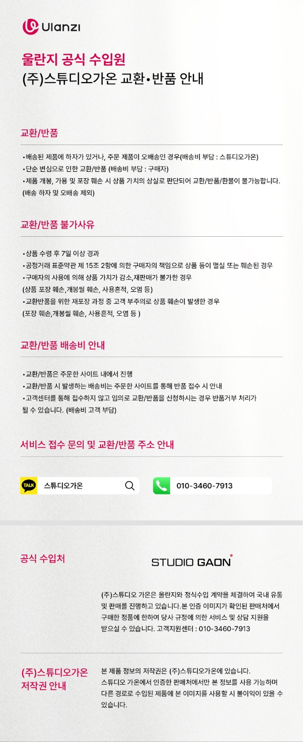 - 반품접수 기한이 지난 경우, 제품 및 패키지 훼손, 사용 흔적이 있는 제품은 교환/반품이 불가합니다.